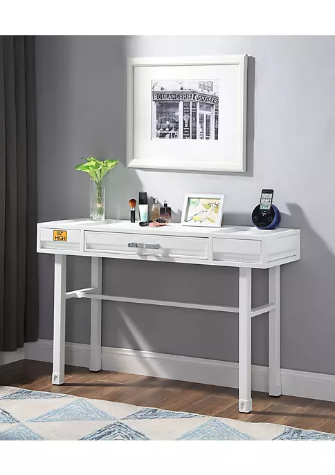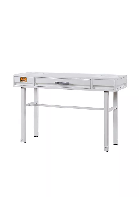 Product Details : KD; Rectangular Vanity Desk : Storage: 1 Drawer : Feature: Metal Frame; Recessed Panels (Cargo Container Panels) :: CONSTRUCTION :: Metal Top: Iron Plate (40 x 40mm); Drawer w/Wood : Metal Straight Legs : Drawer: GLIDE Side Metal (Ball Bearing; 3/4 Ext.); DOVETAIL NOT Included; Fully Finished Inside (FELT-LINED NOT Included); SAFETY STOP Included; Manual Close; Hardware: Single Handle; Finish Material